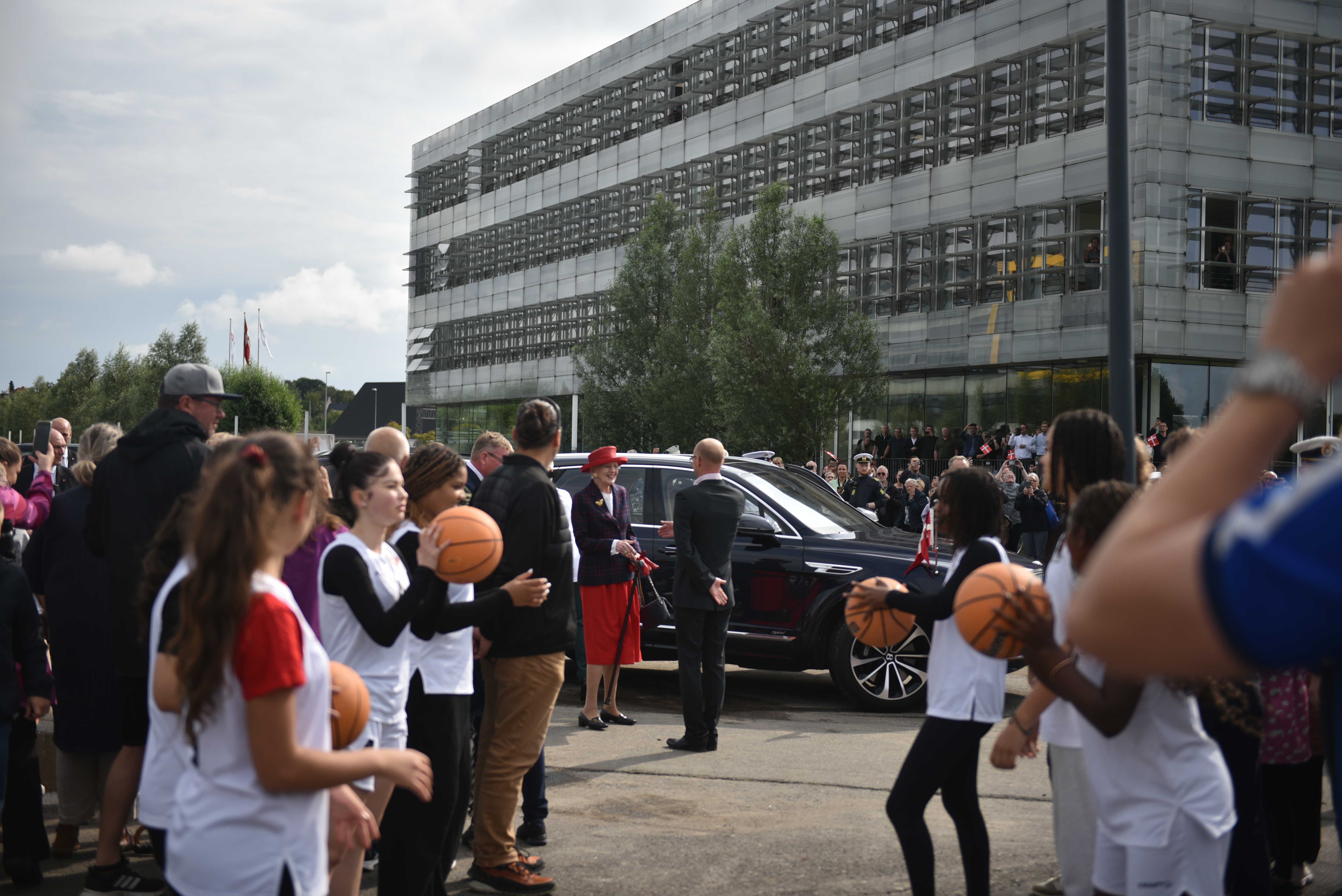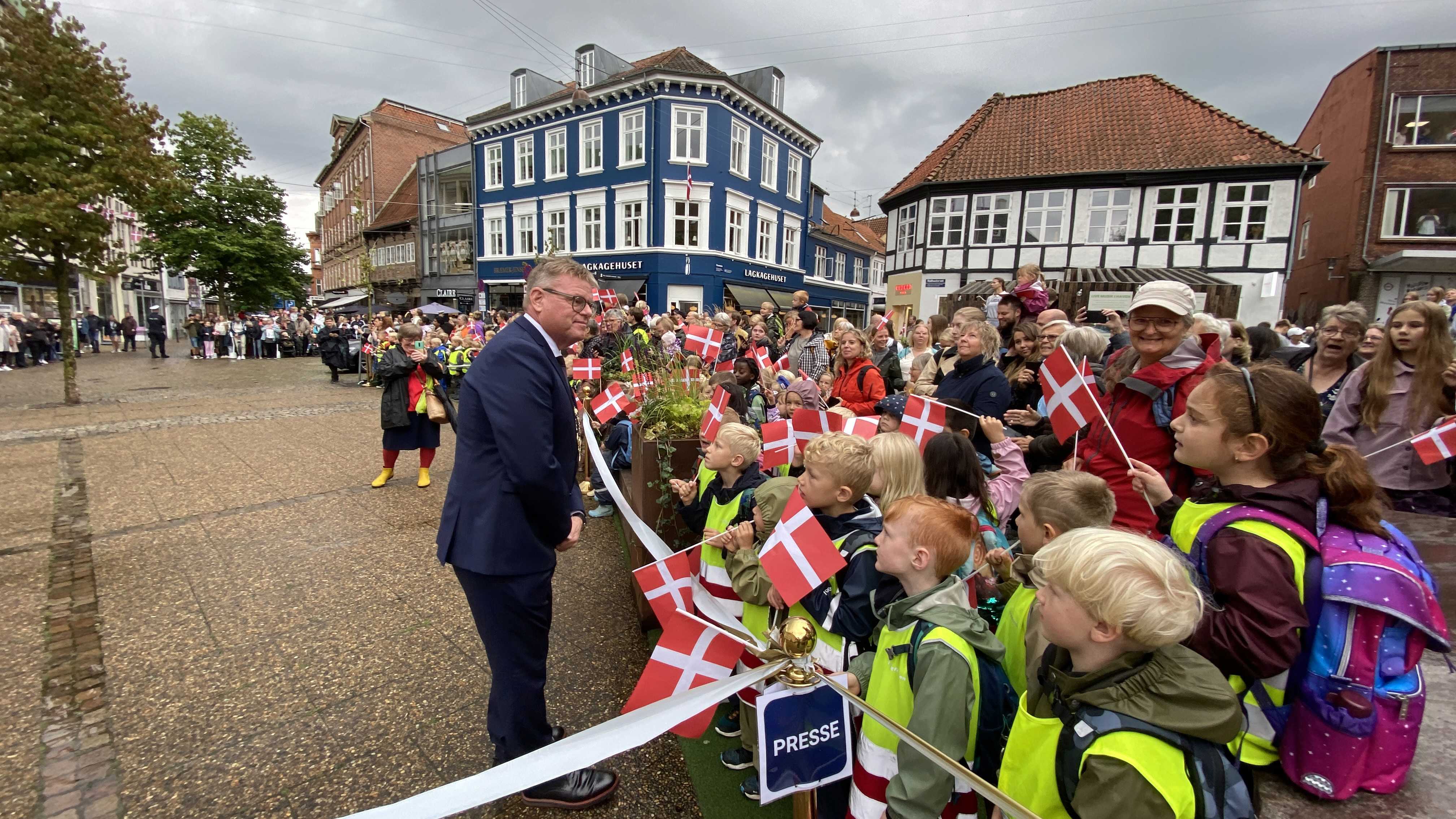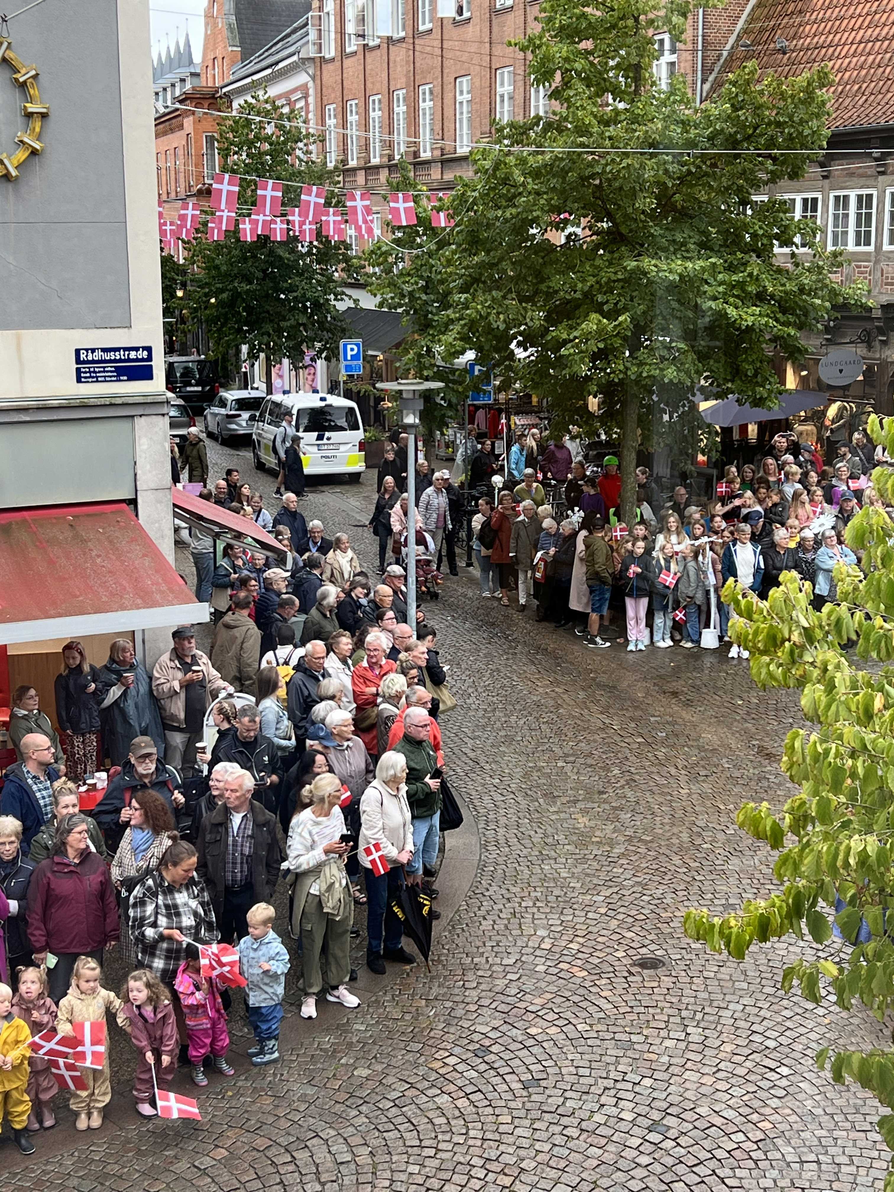 Hendes Majestæt Dronningen er nu ankommet til Det Gamle Rådhus. Udenfor stod rigtig mange klar til at vinke til Dronningen.