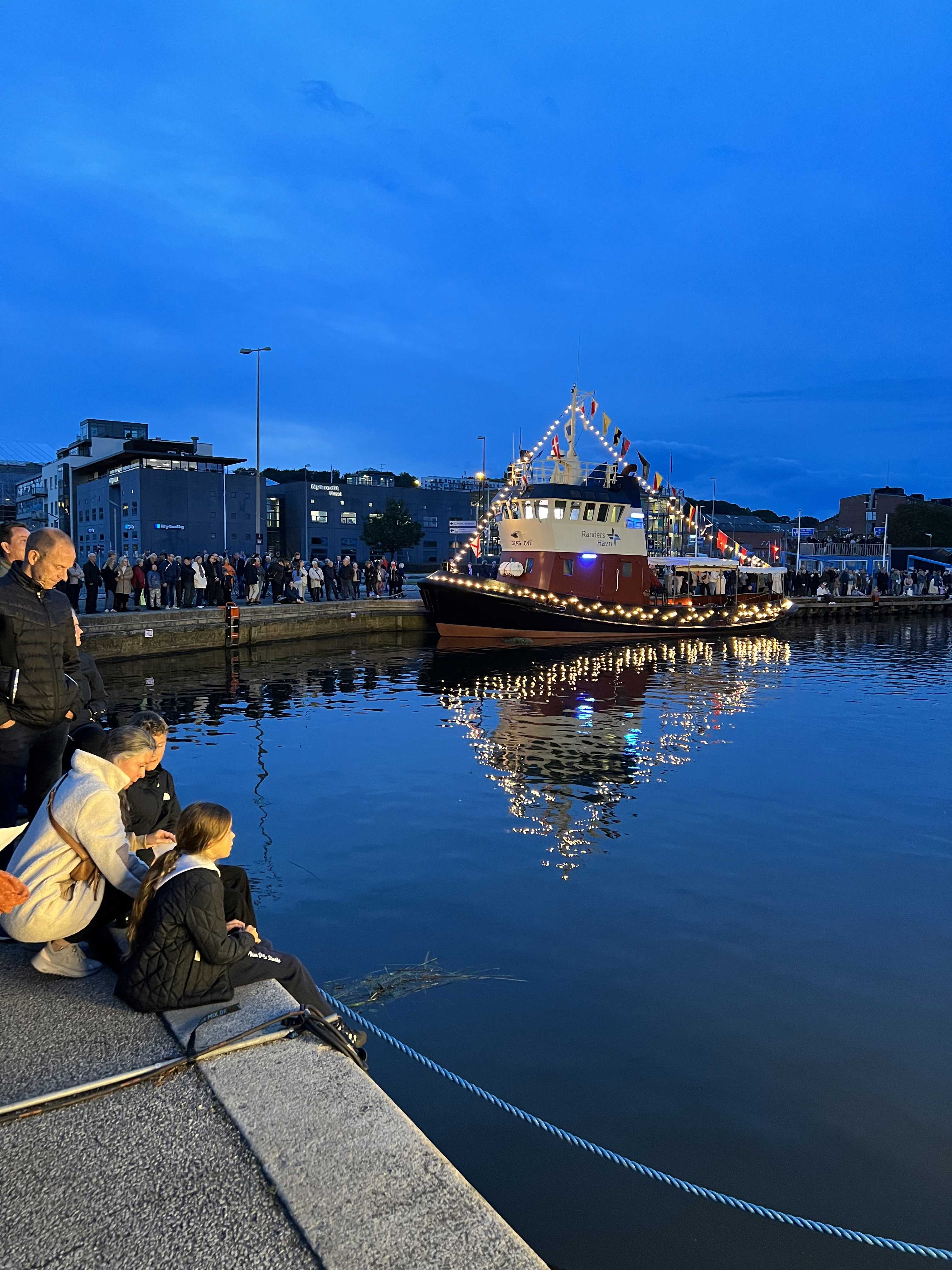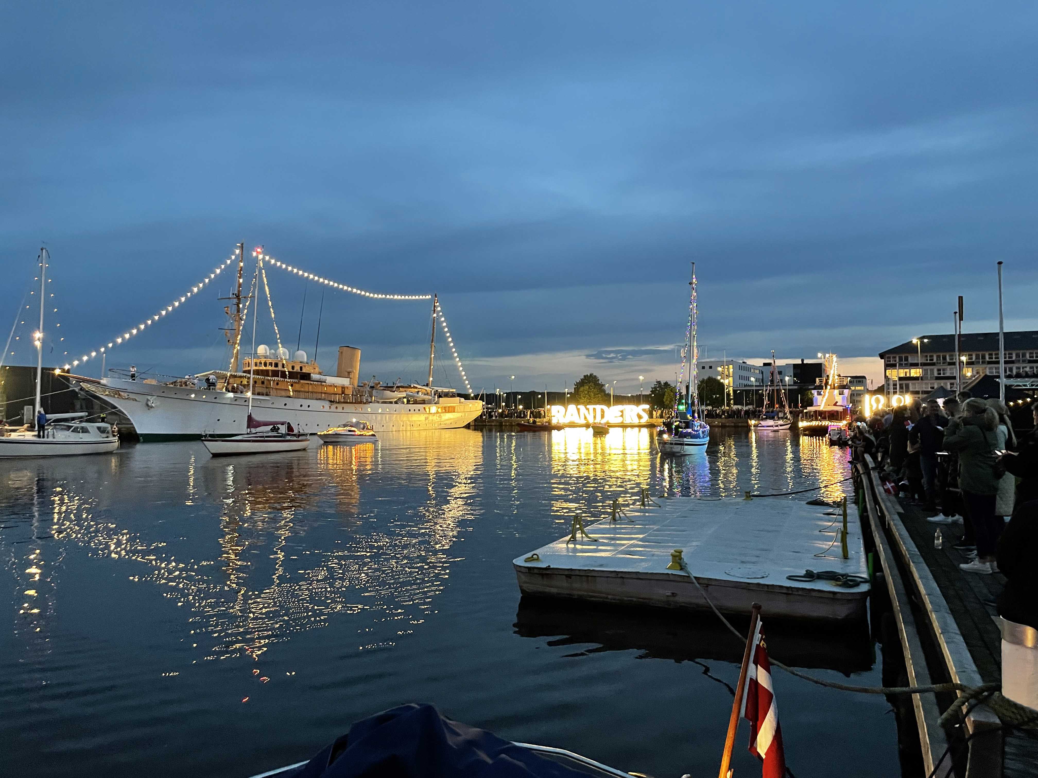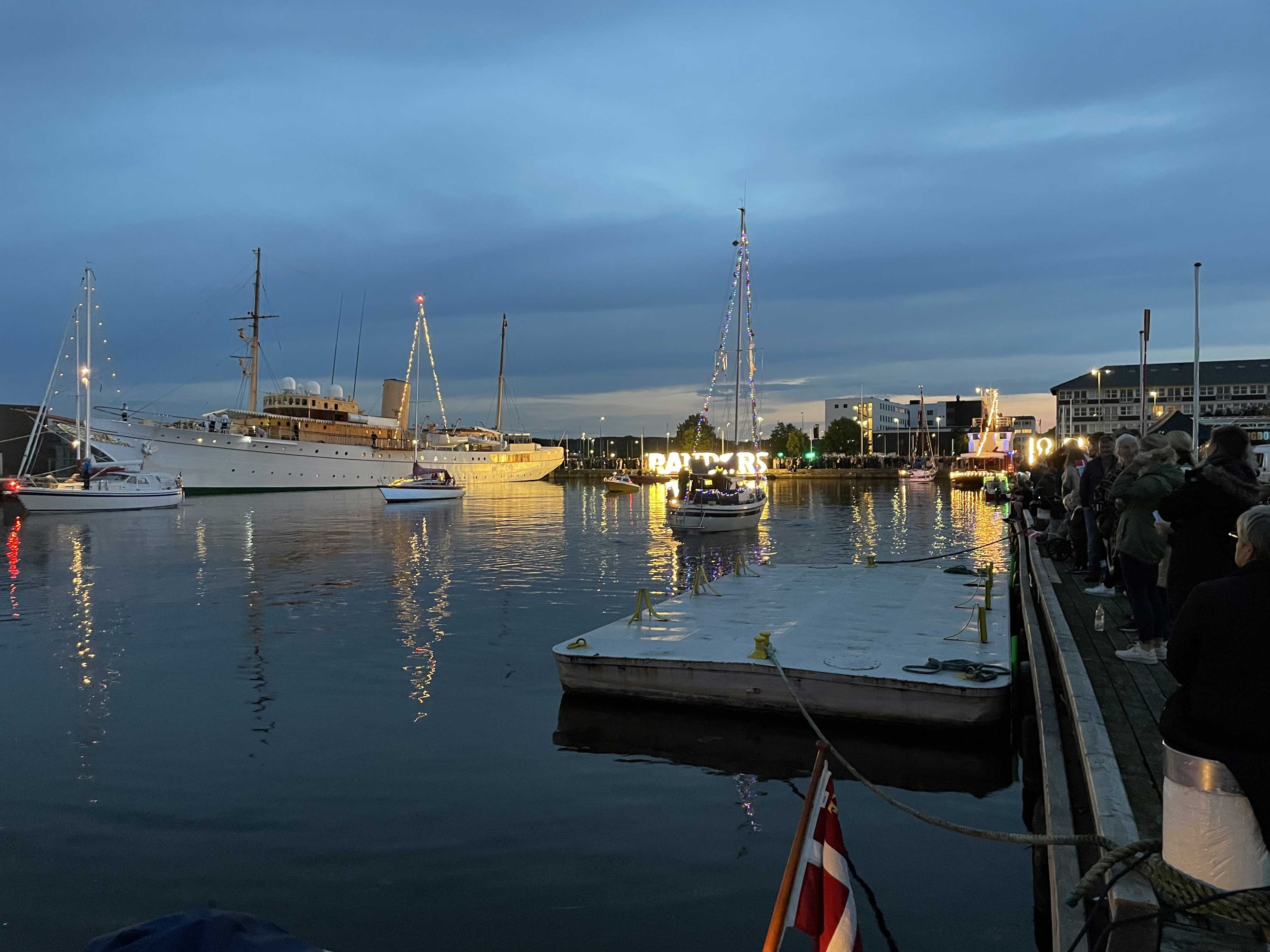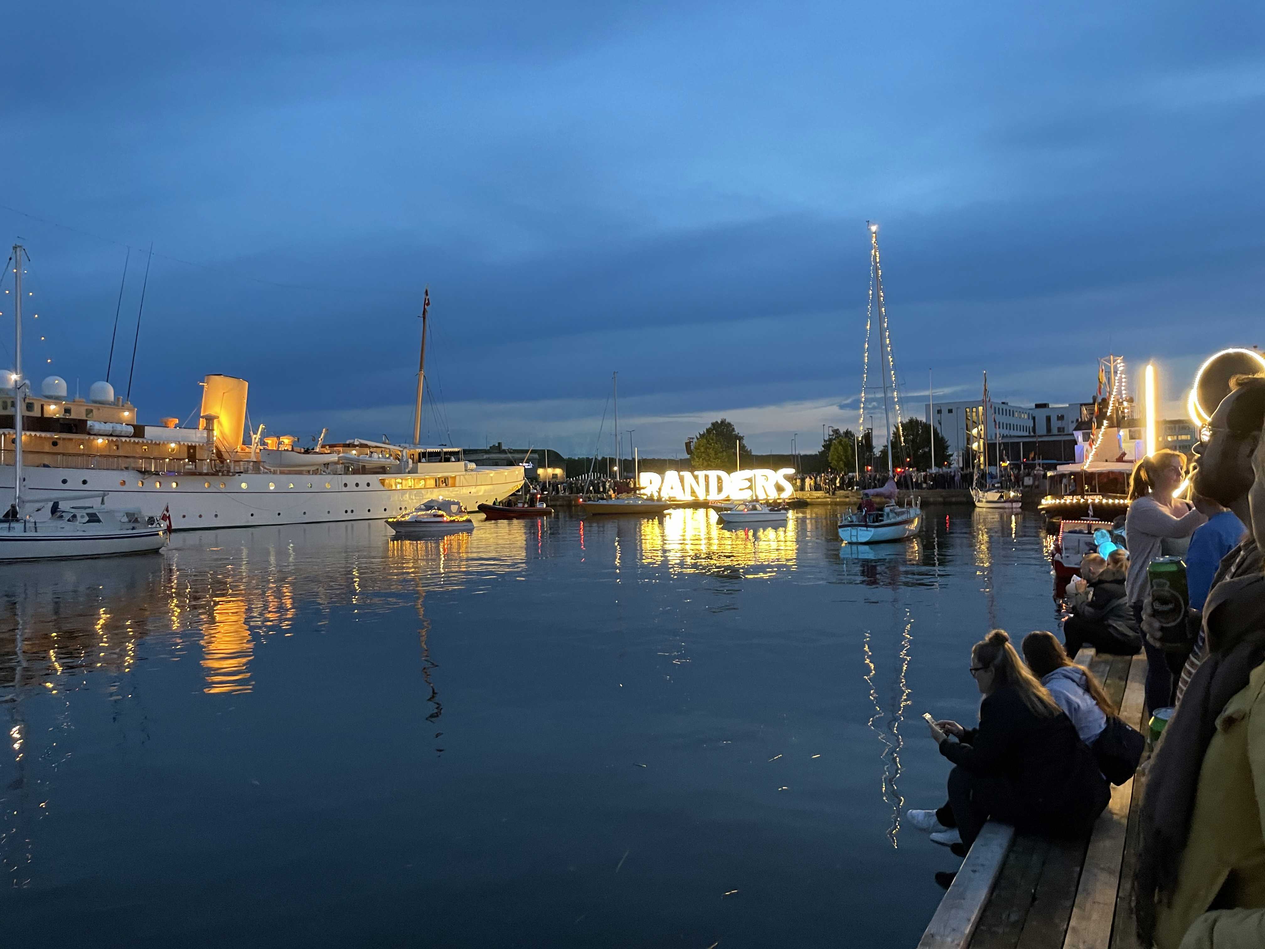 Både med lys sejler rundt i havnebassinet. Randers Ungdomsskoles krone, Randers-bogstaverne og skorstenen lyser også op.