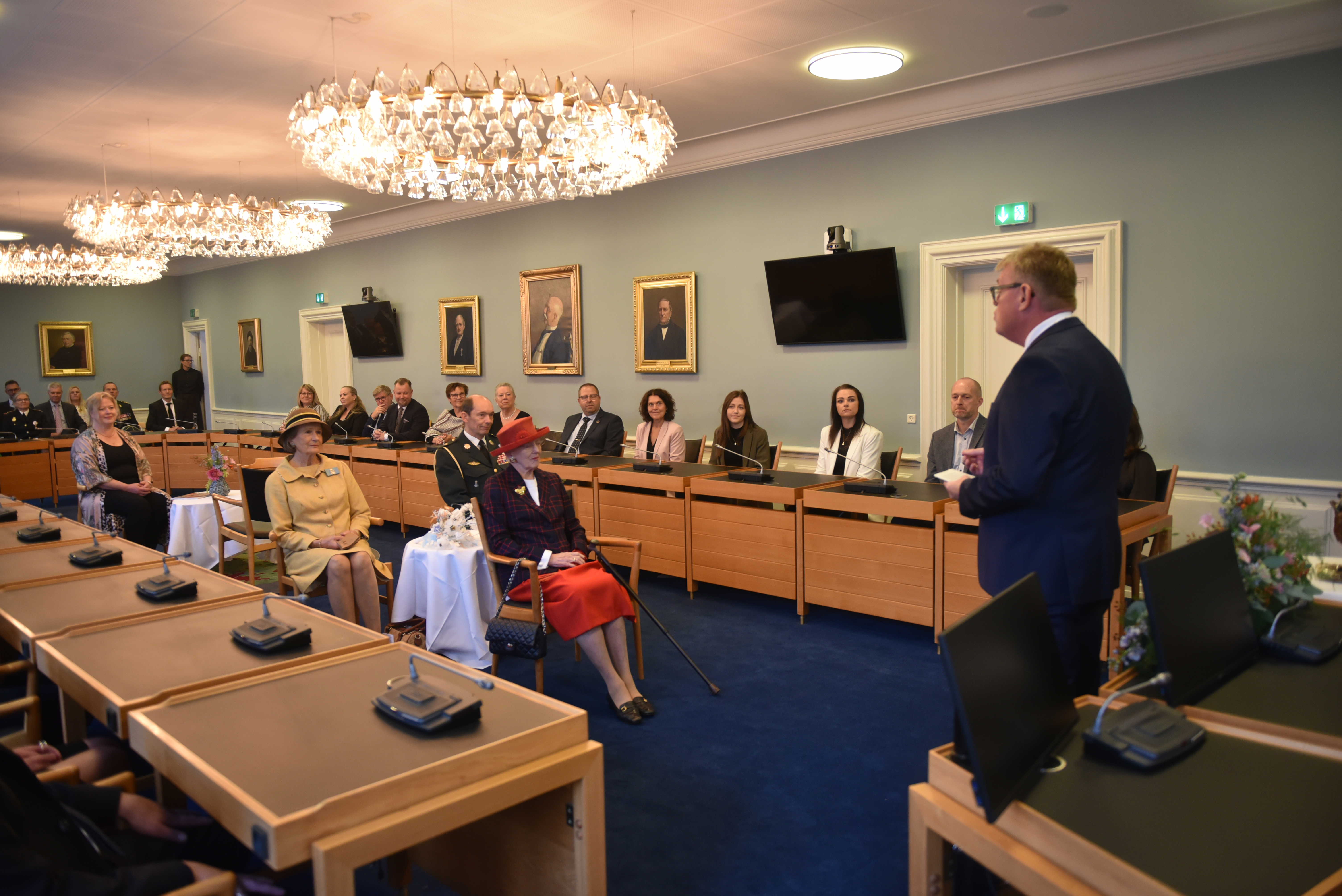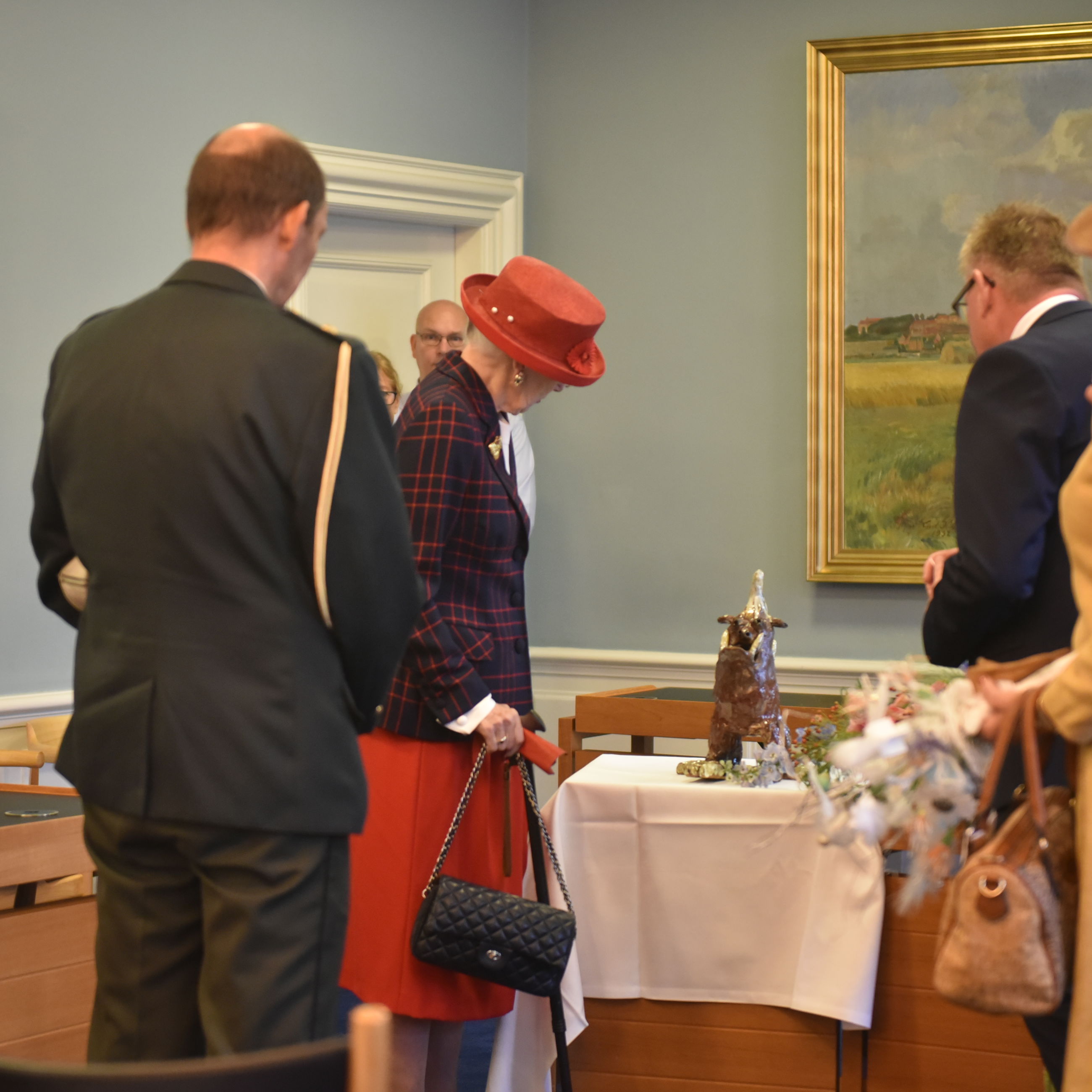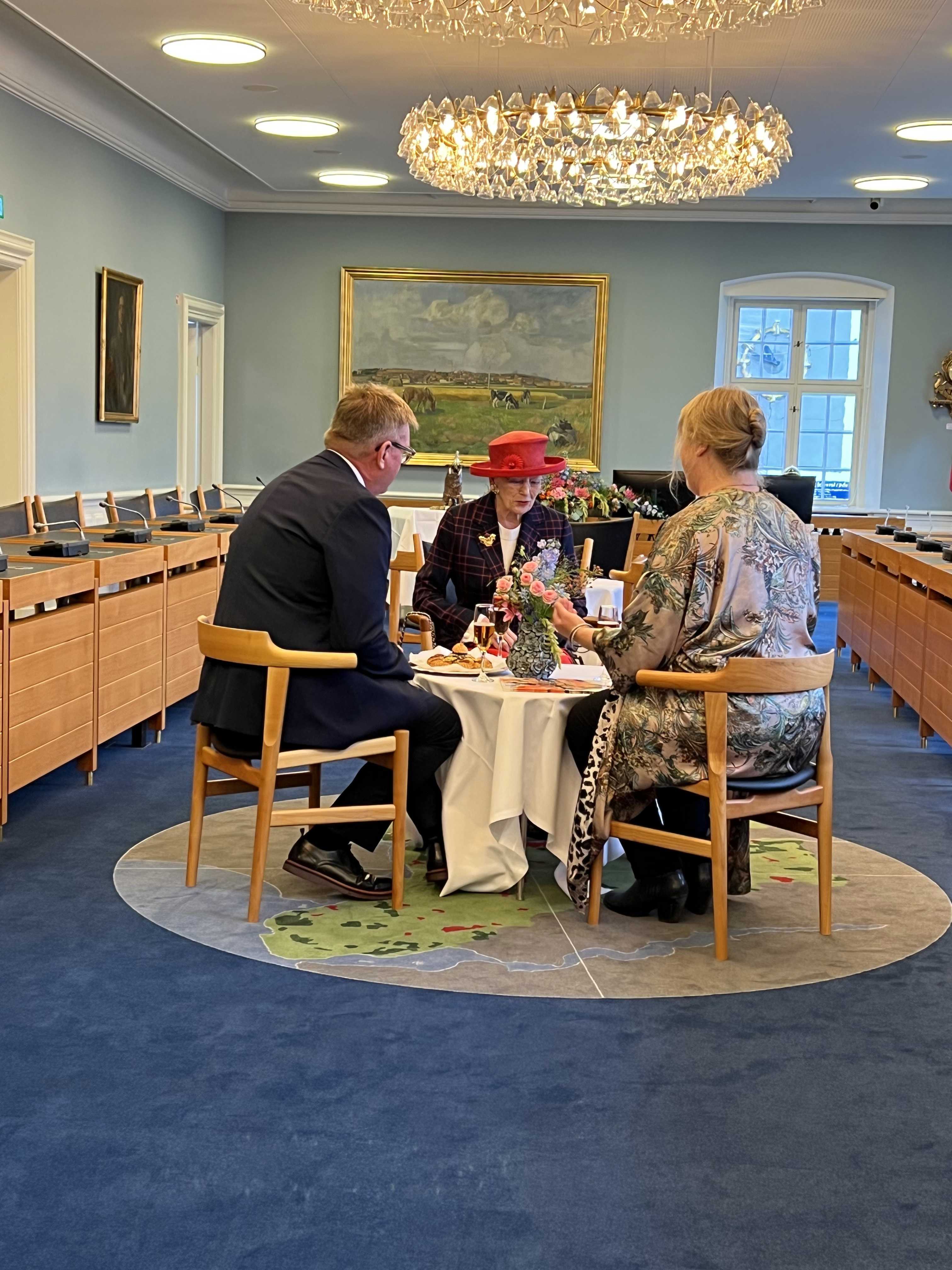 I byrådssalen på Det Gamle Rådhus fik H.M. Dronningen kransekage og mousserende æbleisvin sammen med medlemmerne af Randers Byråd og museumsdirektør Lise Jeppesen fra Randers Kunstmuseum.
