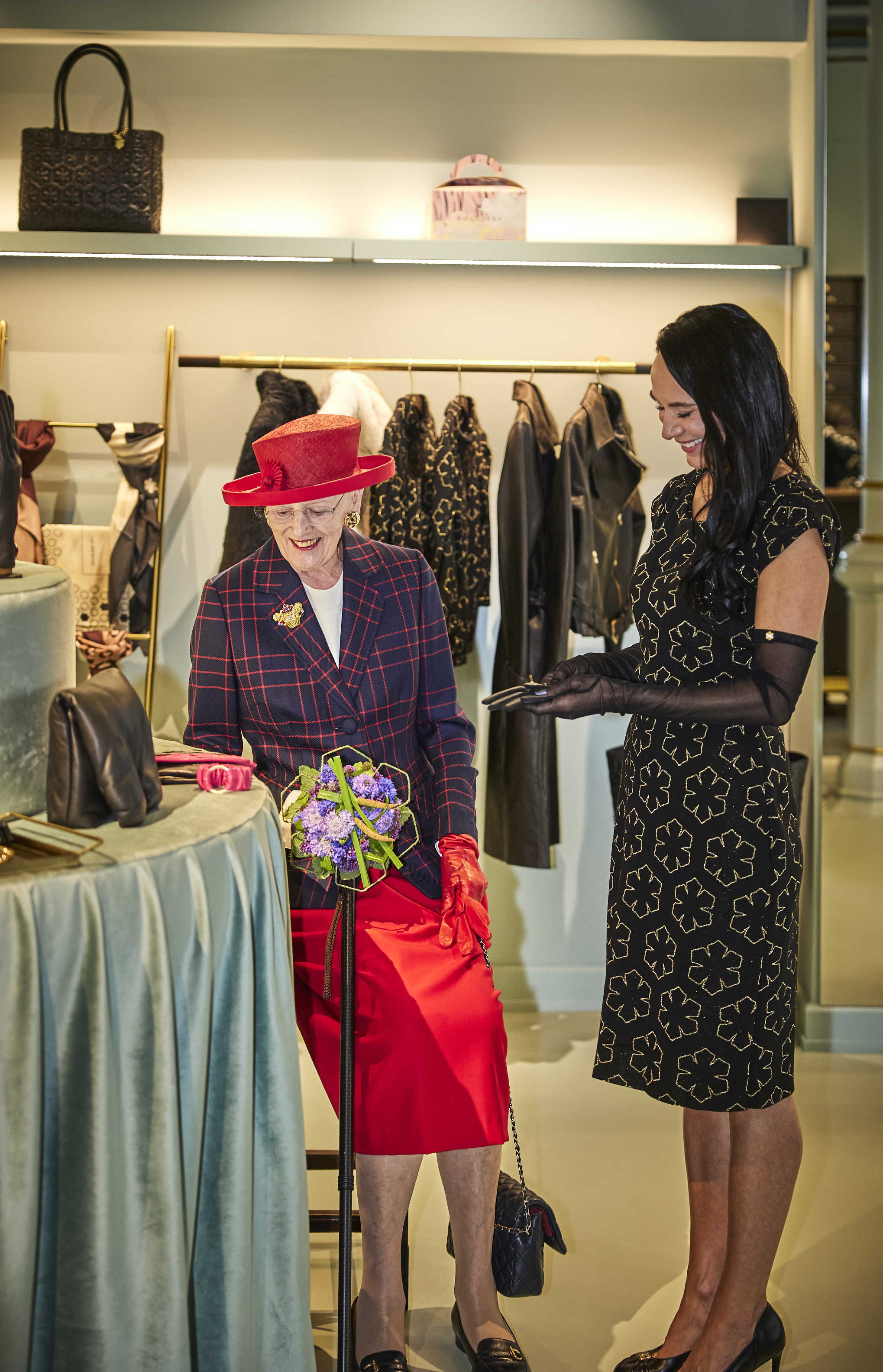 Hendes Majestæt Dronningen fik overrakt en helt særlig gave af indehaver Rina Hansen. Det er en specialsyet Svanetaske med matchende handsker fra kollektionen De Kongelige Dådyr. Det trangarvede læder blev oprindeligt lavet til Kong Christian 10. af Danmark i 1930'erne af RHANDERS. De er fra den kongelige skov, Dyrehaven, der i dag er på UNESCO’s verdensarvsliste, og læderet betegnes derfor som et nationalklenodie – et stykke udsøgt dansk kulturarv.