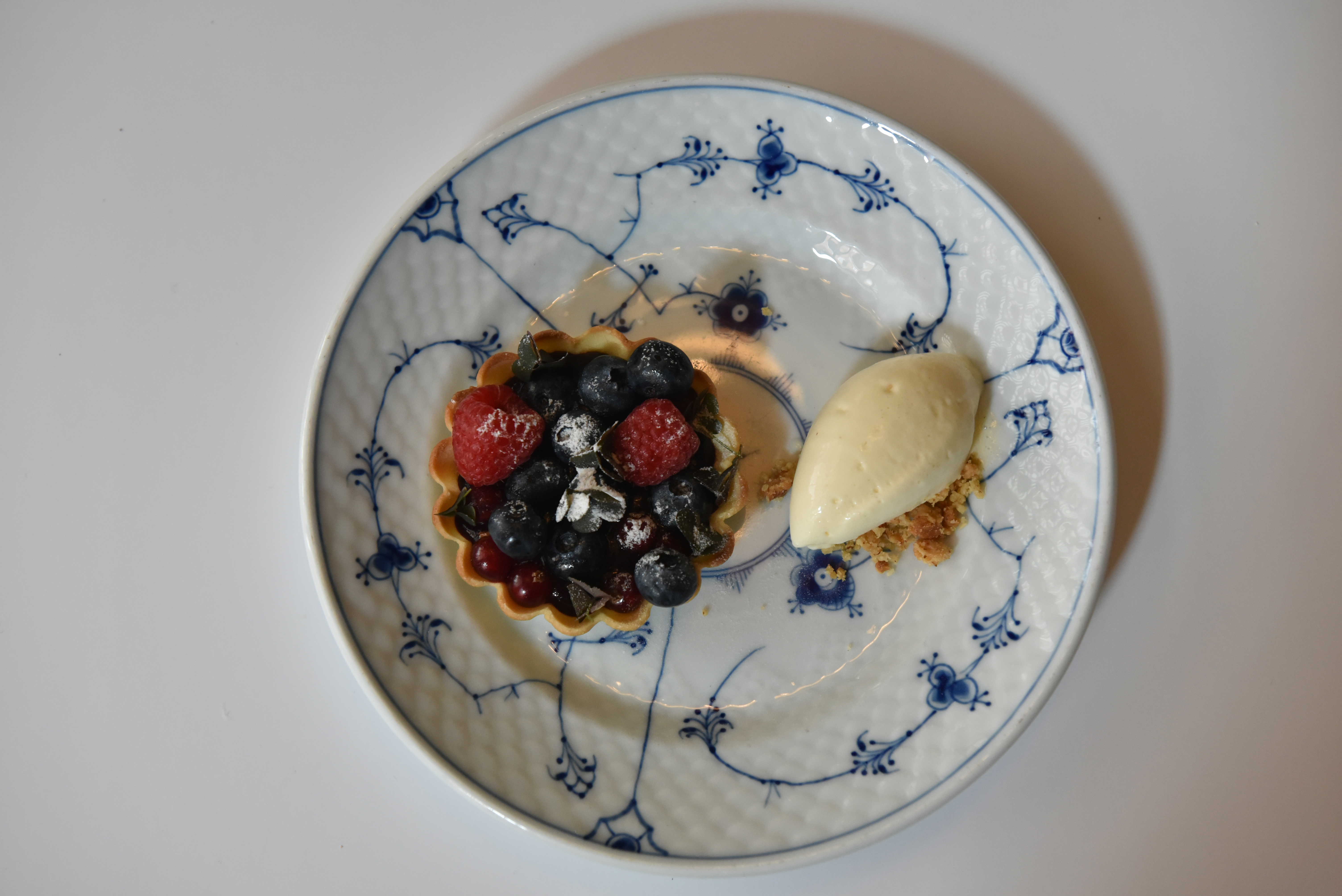 Desserten var sprød tærte med danske bær fra Morgendagens Grøntsager, bærpure, vaniljeis og skovsyre.