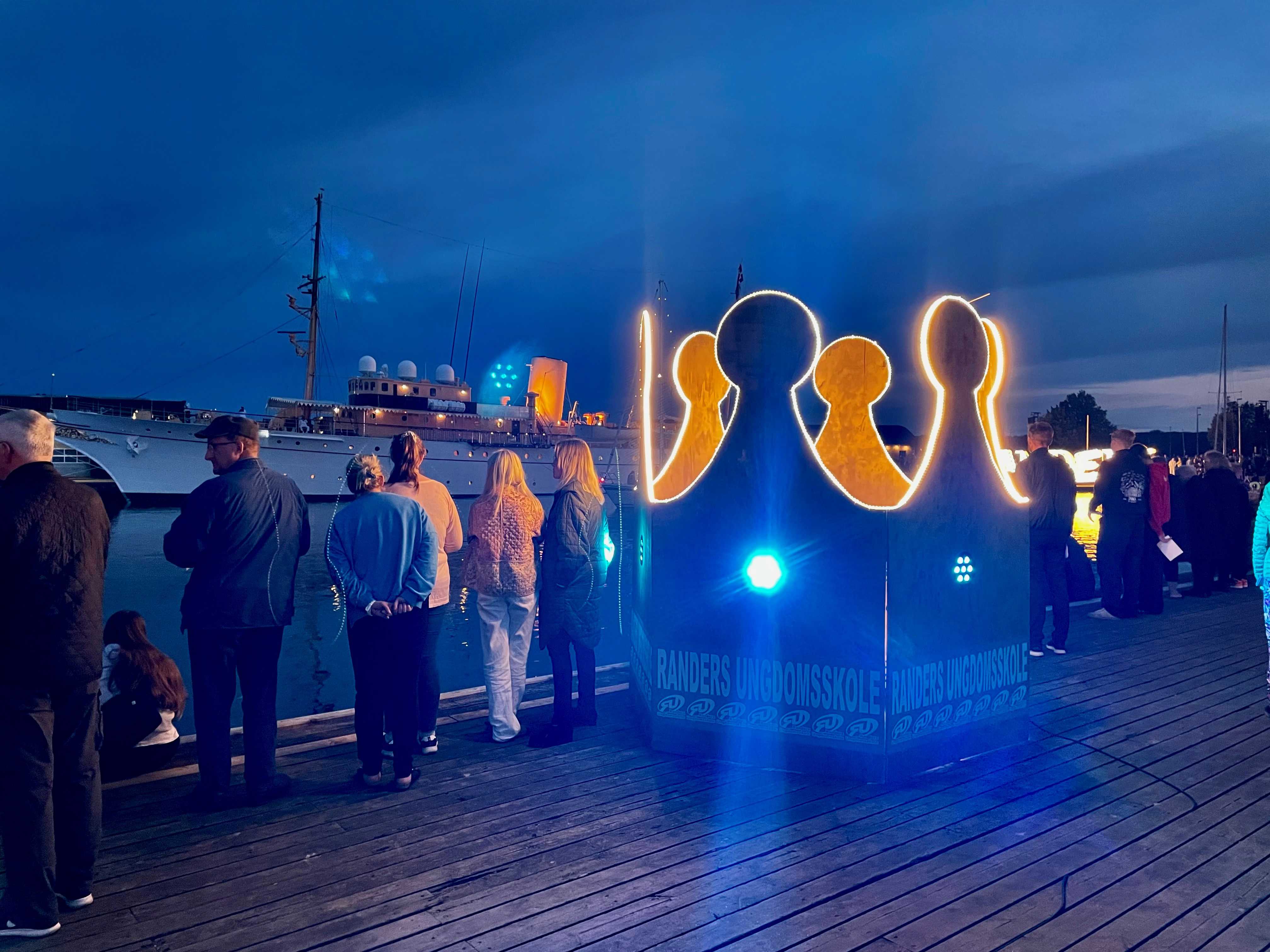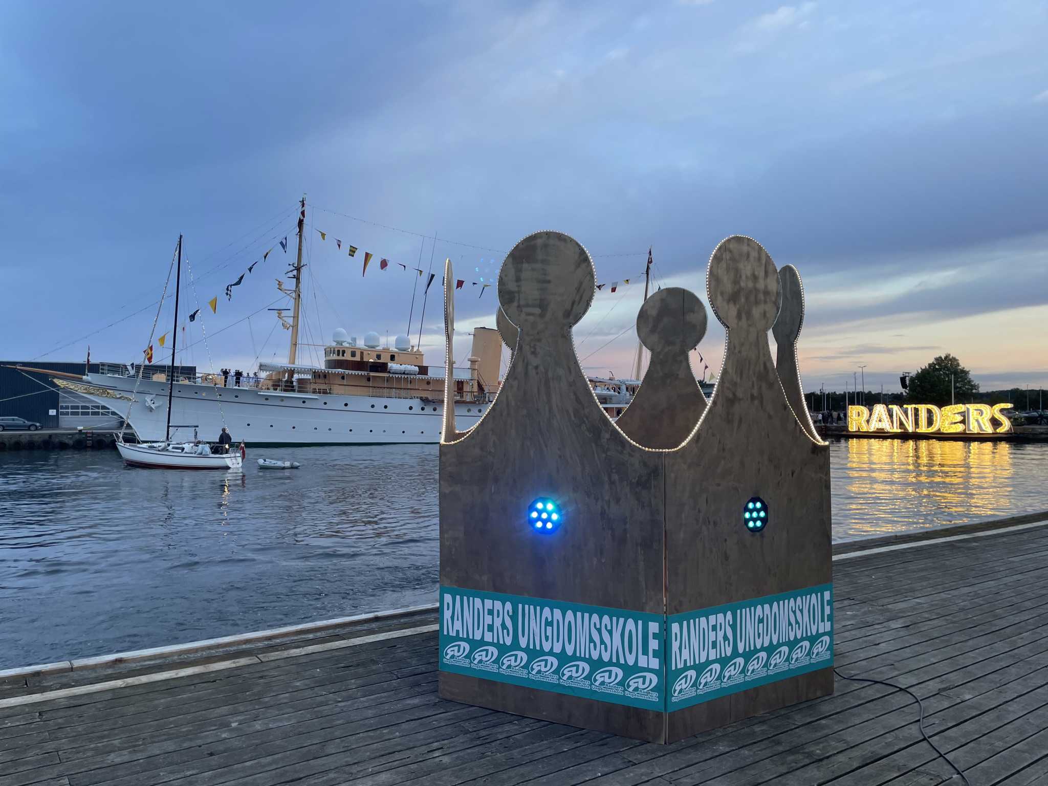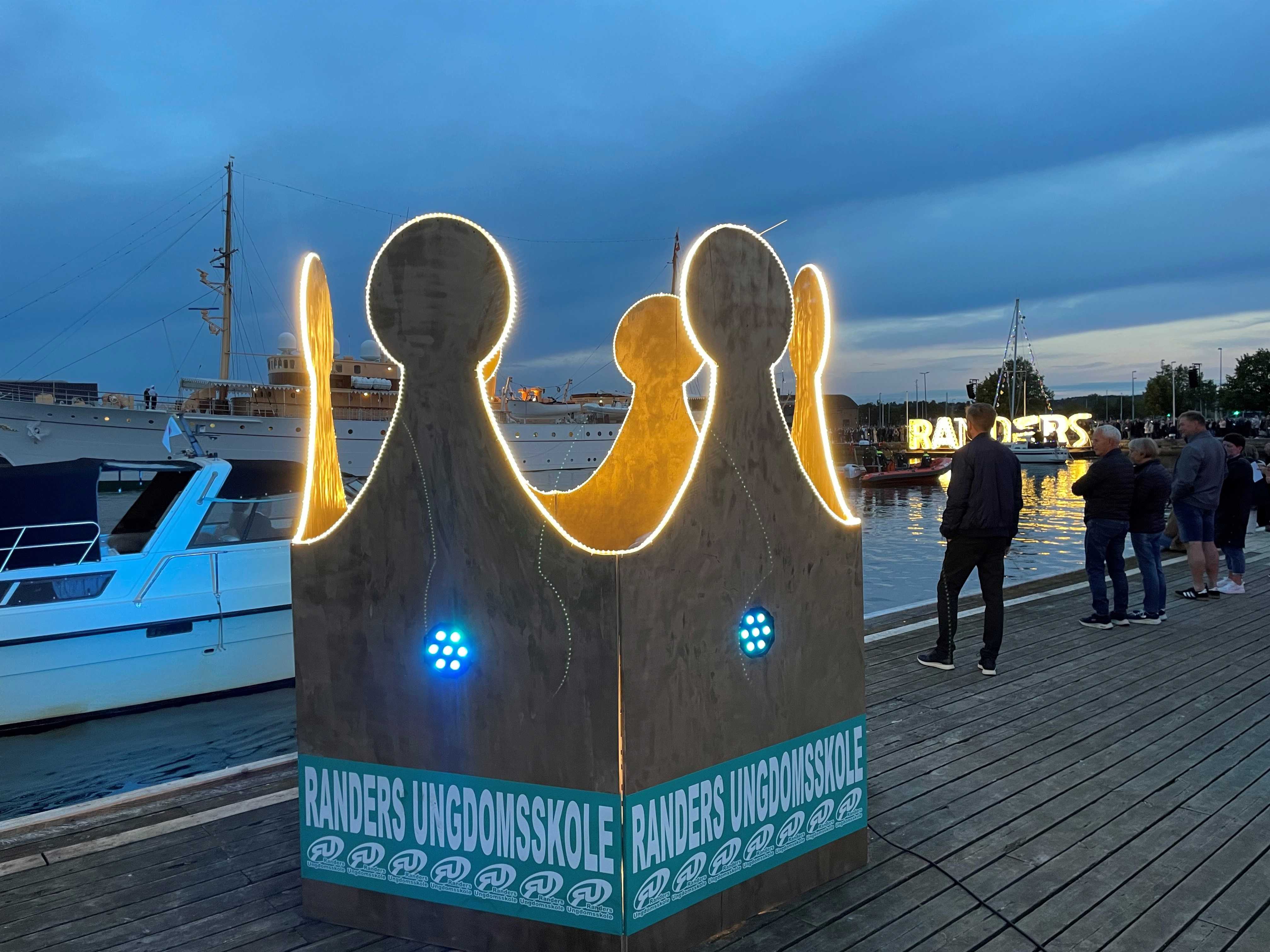 Der varmes så småt op til lysfest på Randers Havn i anledning af H.M. Dronningens besøg. Randers Ungdomsskole har bygget en krone, der er 2,5 meter i højden. Den lyser lige nu. Du kan gå ind i kronen og evt. tage et foto.