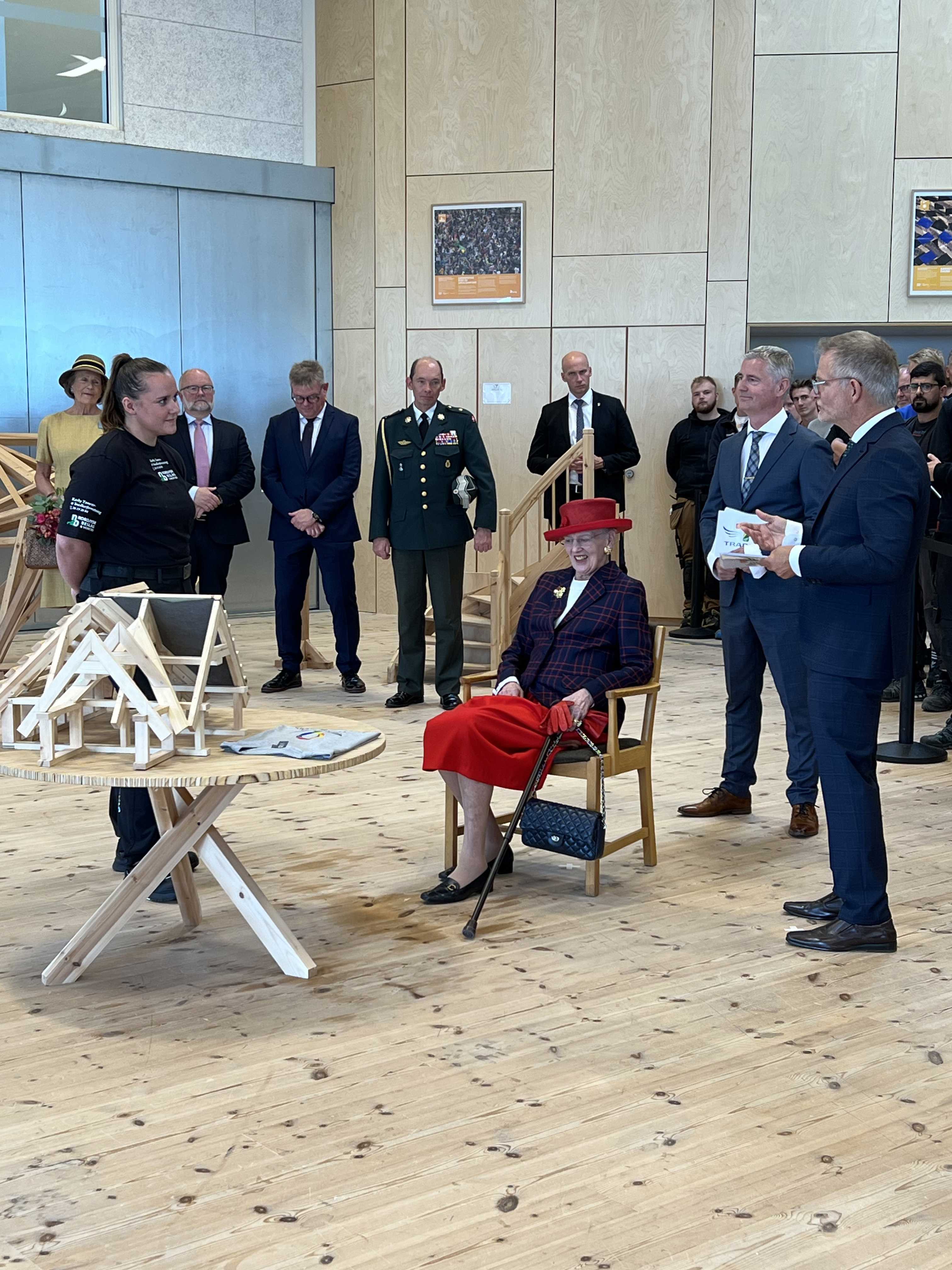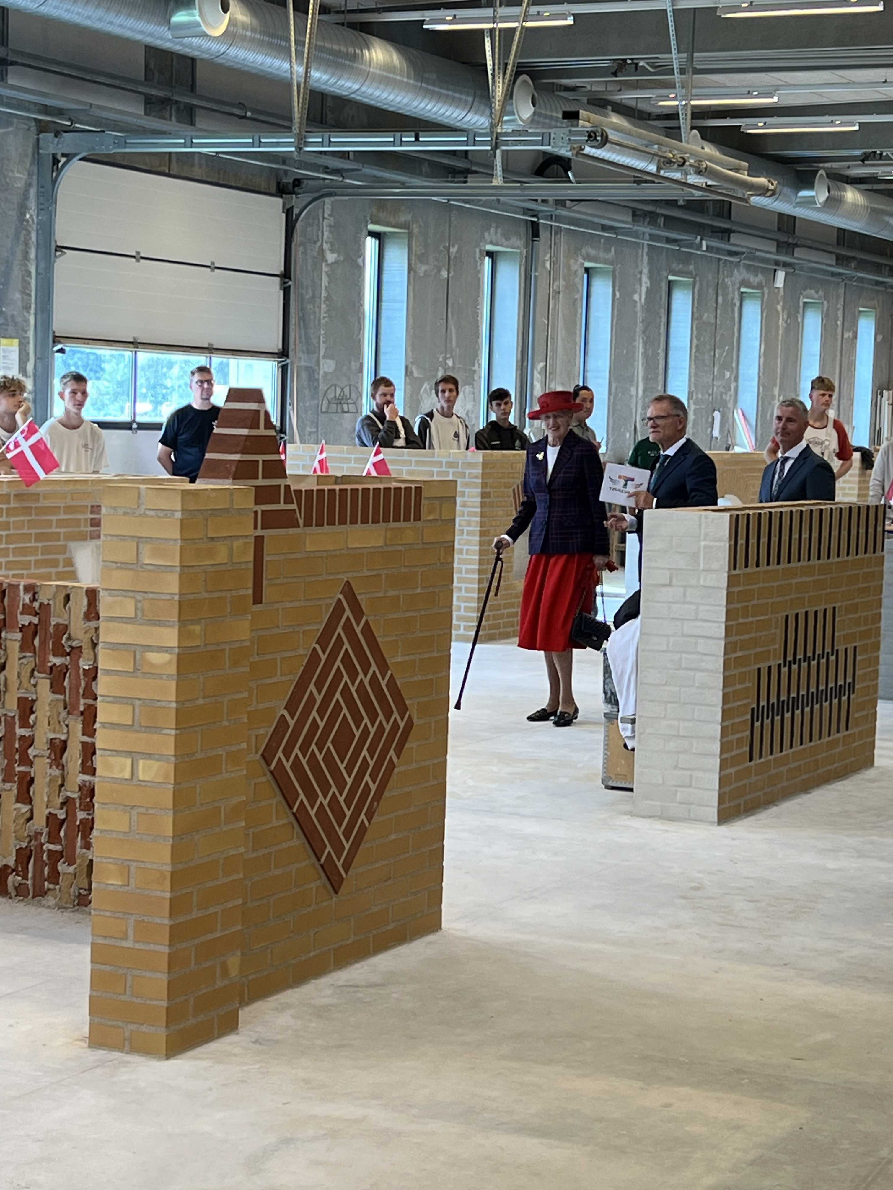 Det er duften af savsmuld, mursten og mørtel, der mødte Hendes Majestæt Dronningen på Tradium. Her hilste Dronningen på tømrerlærlingen Caroline Ullits, der er aktiv i Tradiums kvindenetværk. I murerværksted mødte Dronningen eleverne Casper Bisgaard Ravn og Patrick Dahl Gråbæk. Casper forbereder sig på den afsluttende svendeprøve, mens Patrick netop har færdiggjort sin uddannelse og flere gange har deltaget i finalen i DM i Skills.