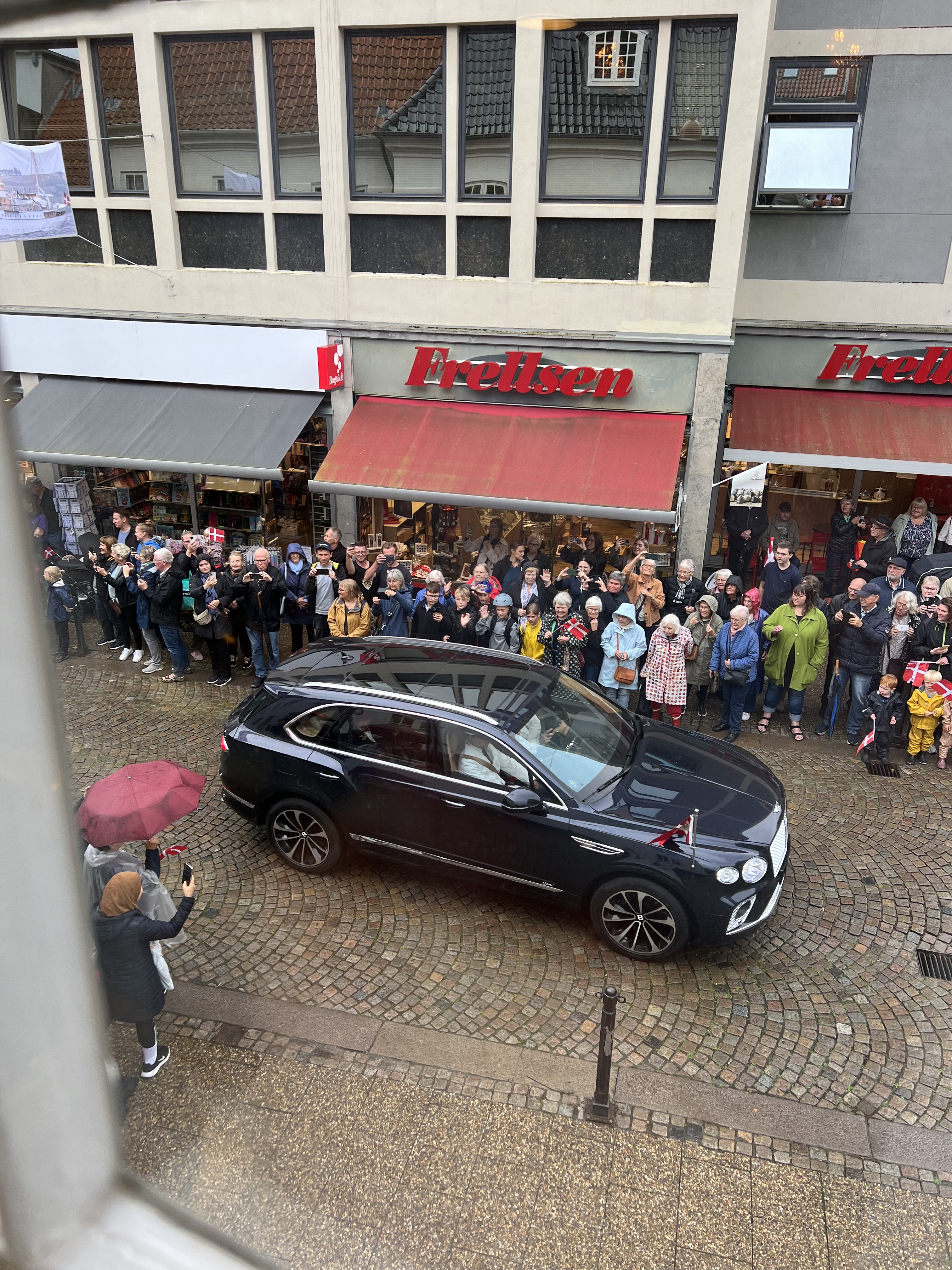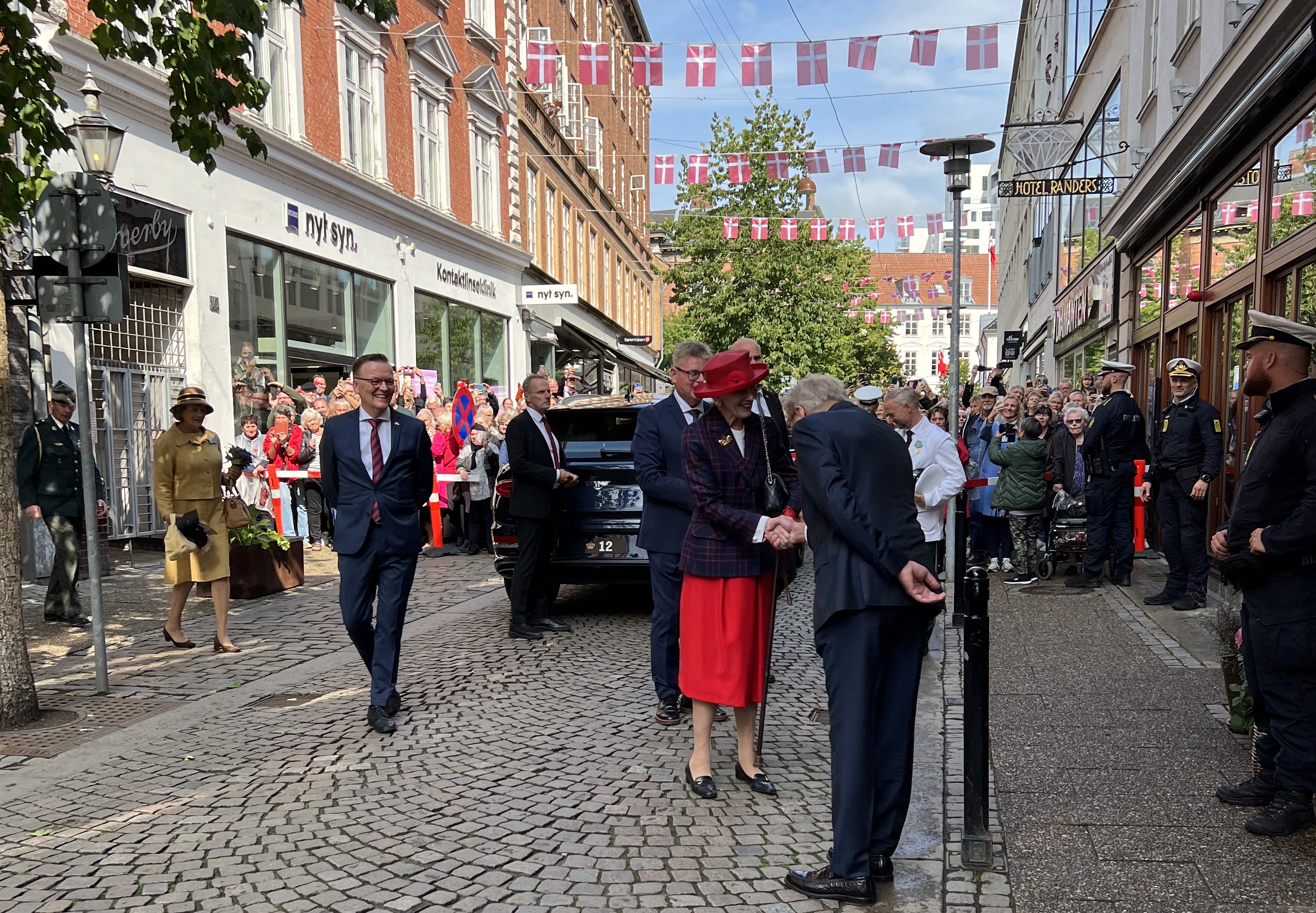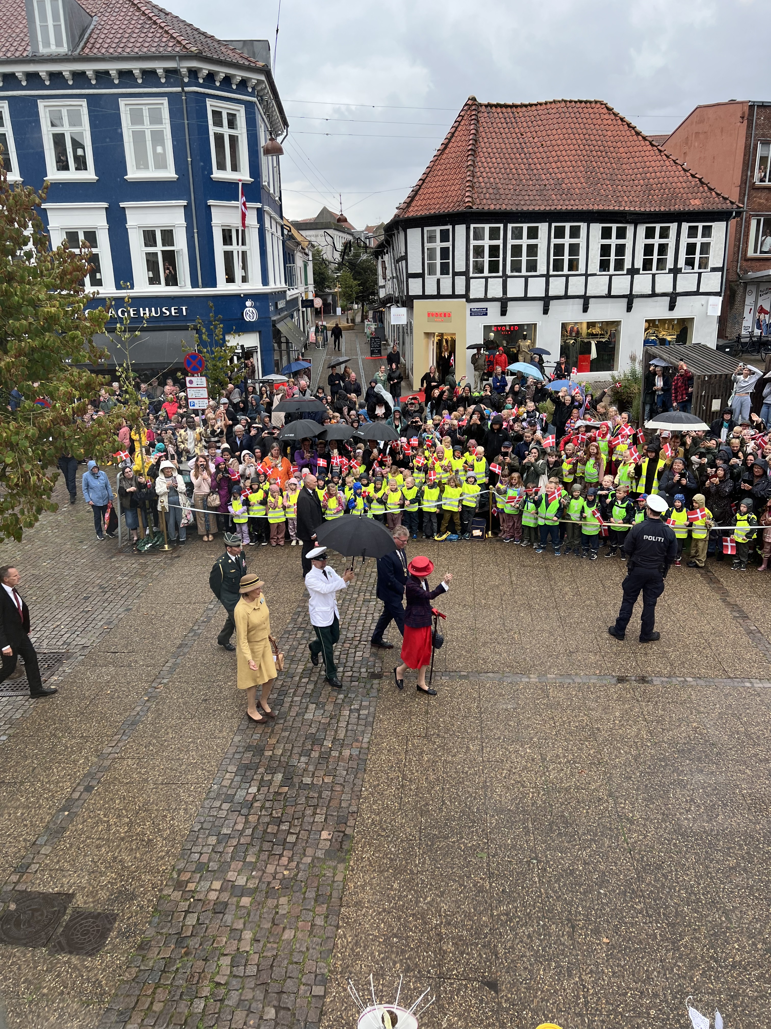 Hendes Majestæt Dronningen er nu ankommet til Det Gamle Rådhus. Udenfor stod rigtig mange klar til at vinke til Dronningen.