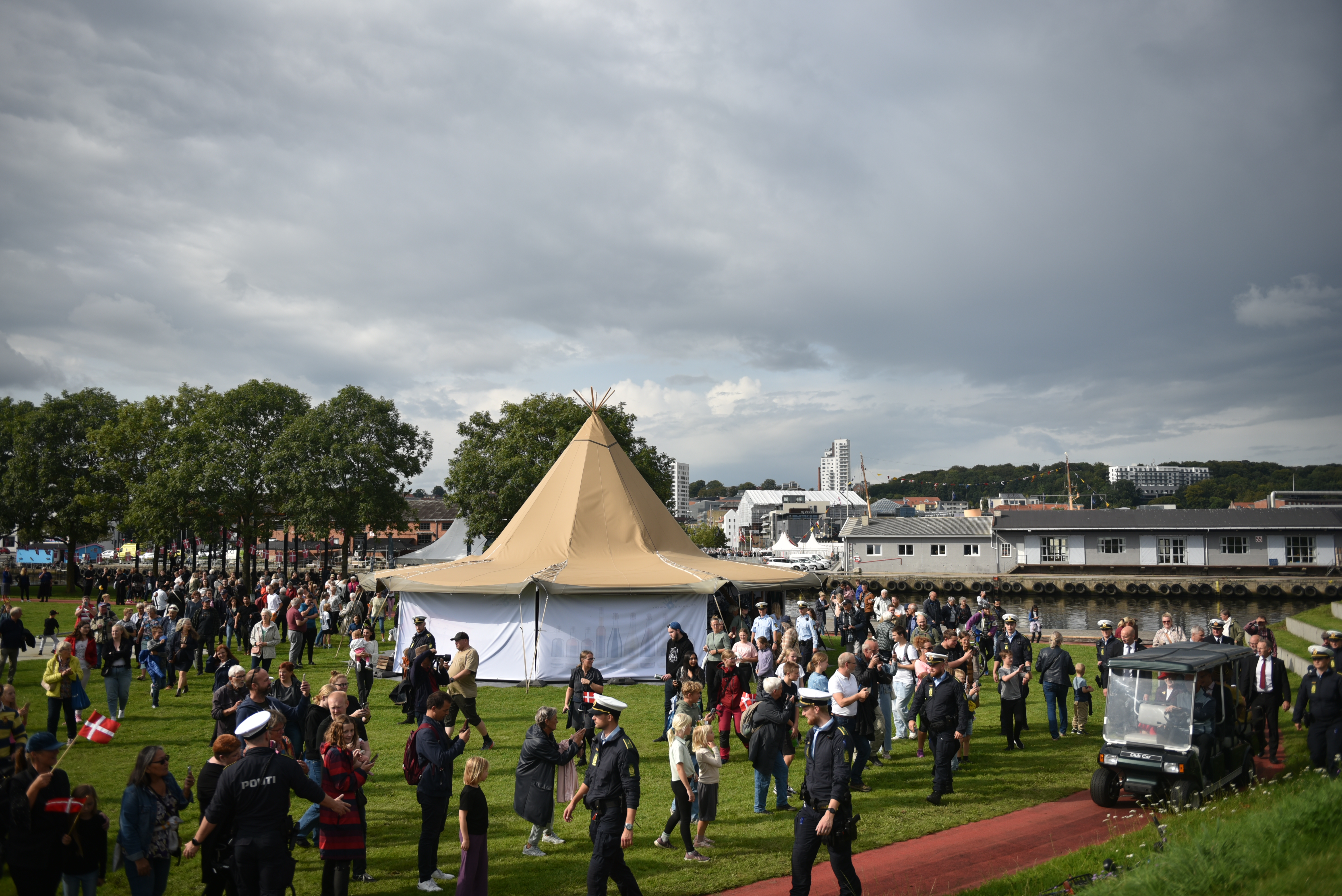 Publikum er klar til at tage imod Hendes Majestæt Dronningen på Randers Havn.