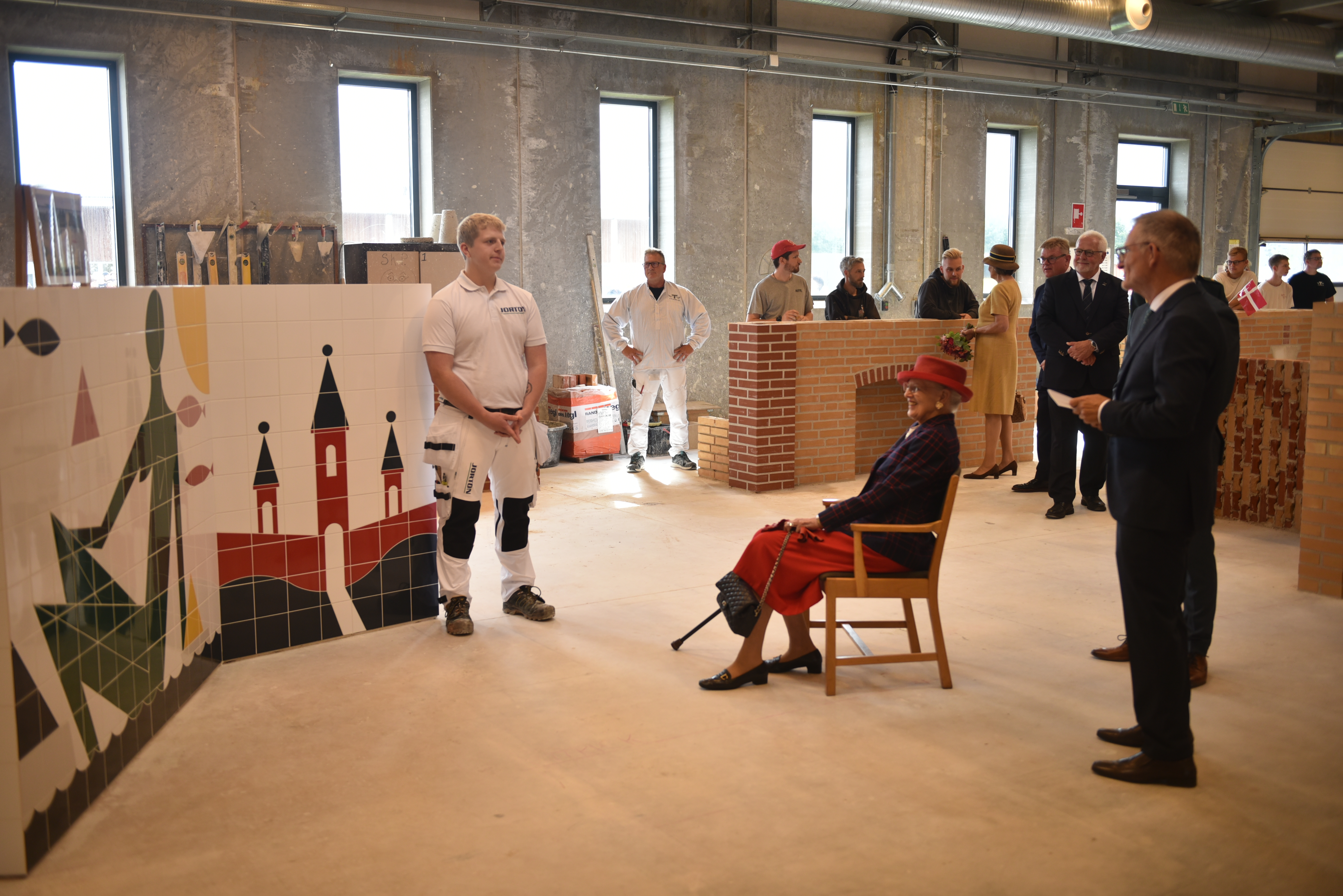 Det er duften af savsmuld, mursten og mørtel, der mødte Hendes Majestæt Dronningen på Tradium. Her hilste Dronningen på tømrerlærlingen Caroline Ullits, der er aktiv i Tradiums kvindenetværk. I murerværksted mødte Dronningen eleverne Casper Bisgaard Ravn og Patrick Dahl Gråbæk. Casper forbereder sig på den afsluttende svendeprøve, mens Patrick netop har færdiggjort sin uddannelse og flere gange har deltaget i finalen i DM i Skills.