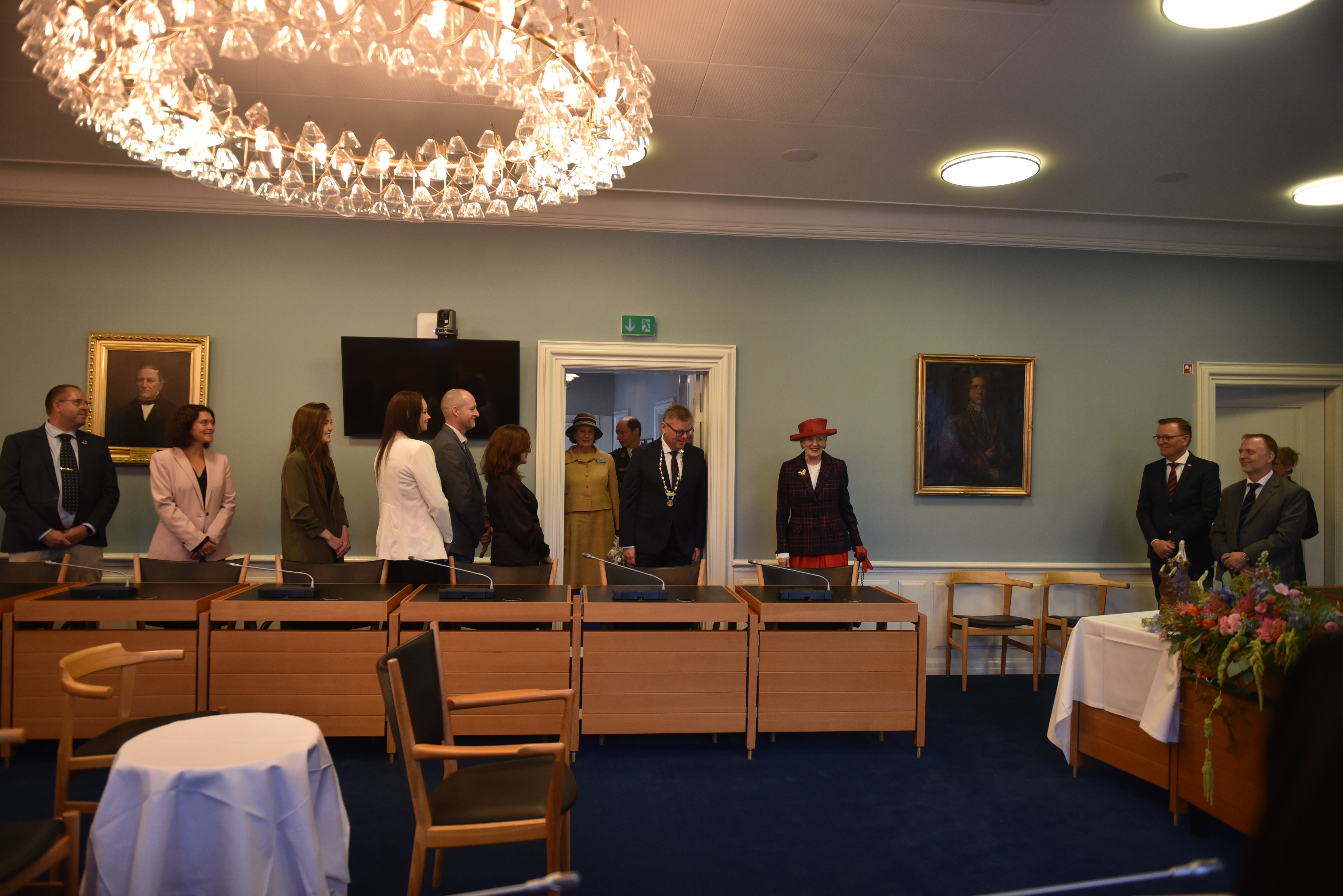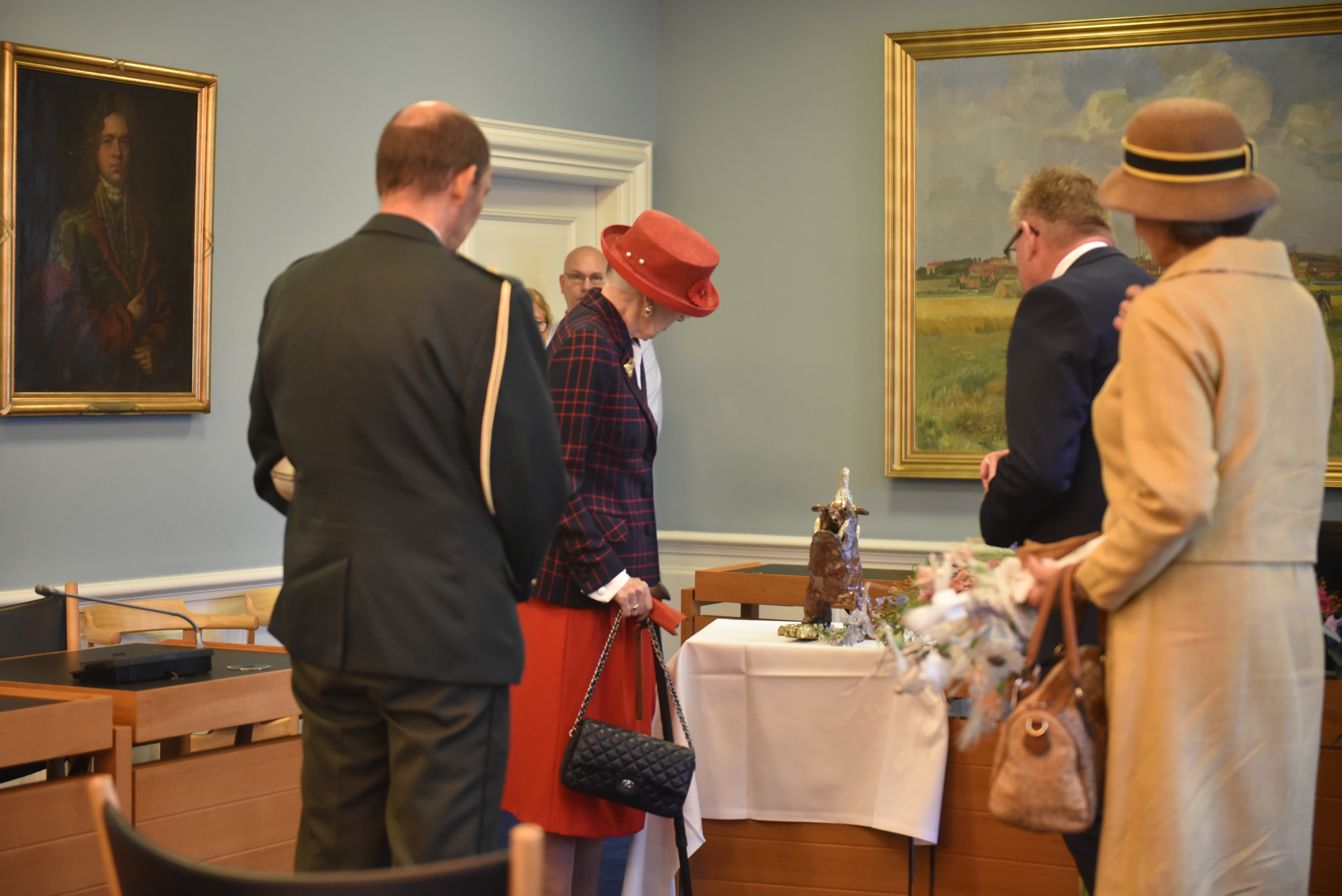 I byrådssalen på Det Gamle Rådhus fik H.M. Dronningen kransekage og mousserende æbleisvin sammen med medlemmerne af Randers Byråd og museumsdirektør Lise Jeppesen fra Randers Kunstmuseum.